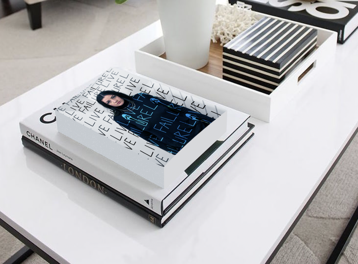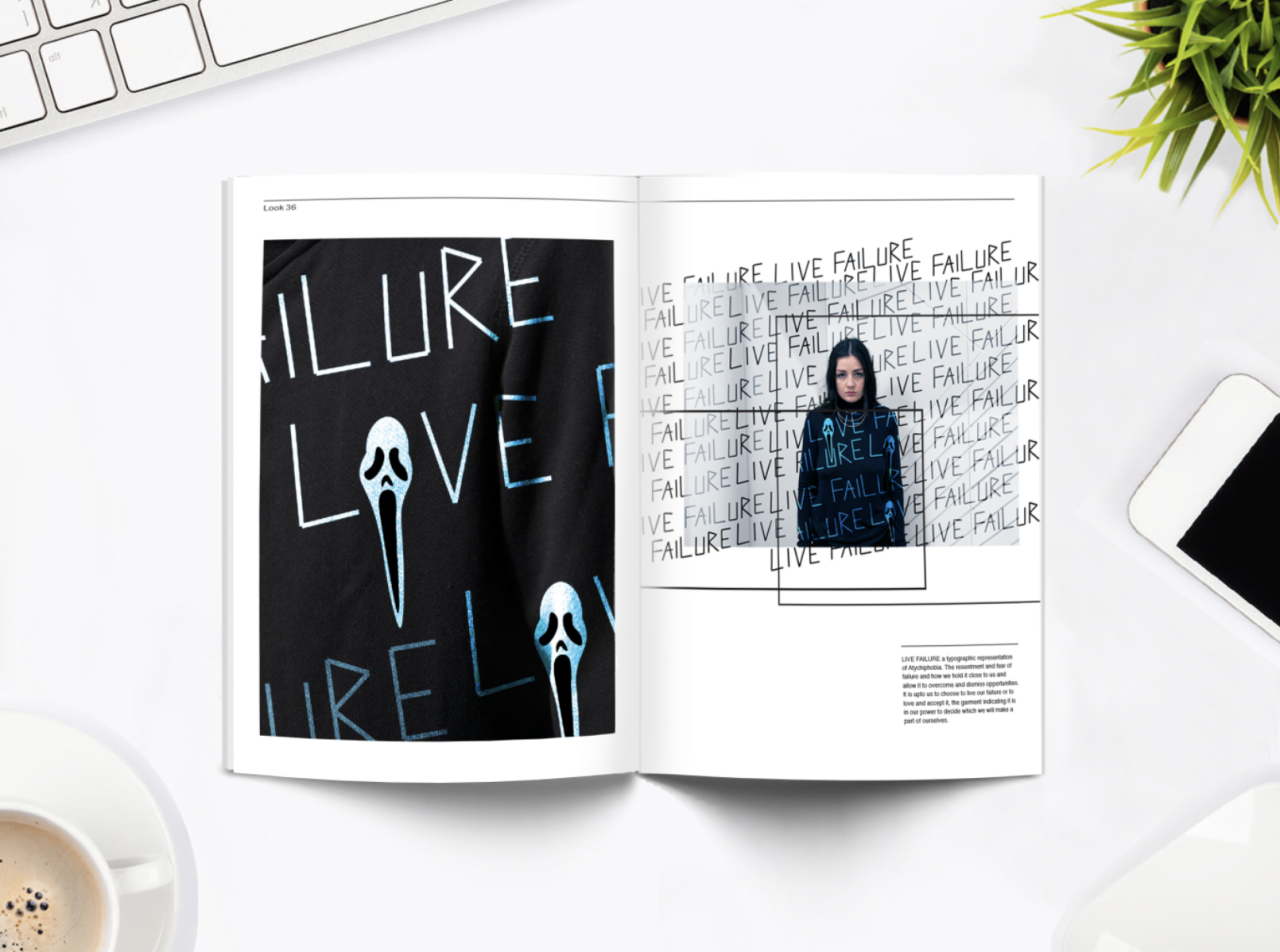 “I want to know if you can live with failure” was a sentence that featured in my poem which channelled something that I struggle with personally. Atychiphobia, a fear of failure is something that has been consistent in my life from when I can remember. I particularly took the two words of “Live Failure” as once I thought into it more I discovered these words could be taken how you please. For me however, it was almost a harsh statement of living through your failure, I wanted to play with this idea through making the fabric of the hoodie be that you can interpret it as Love or Live. Being that it is down to myself and how I decide to let failure control my life, that I become failure or I learn to love the failures I experience. I wanted this to be on the fabric as a representation of something that is close to me and is always with me, almost fitting to the expression of “carrying it on my back”. The background is the original words of “Live Failure” as I wanted to represent the anxiety of living failure taking over my life. This image was created to be busy and almost uncomfortable to look at. Nothing is necessarily meant to be “aesthetic” as the design itself however the presentation as a look book is. The idea of a look book relating back to fashion, something which holds great importance to me and my everyday. Having failure and fashion being combined creating an unsettling contrast for myself. Purposely making myself hyperaware of a phobia yet in a way which I’ve used something that I hold passion for.